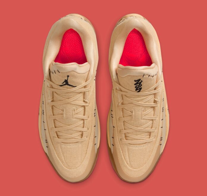 Верх модели выполнен из парусины кунжутного цвета, а по бокам, на пятке и язычке видна броская черная прострочка. Этот грубый вид отличает эти кроссовки от изысканной отделки большинства баскетбольных кроссовок.
